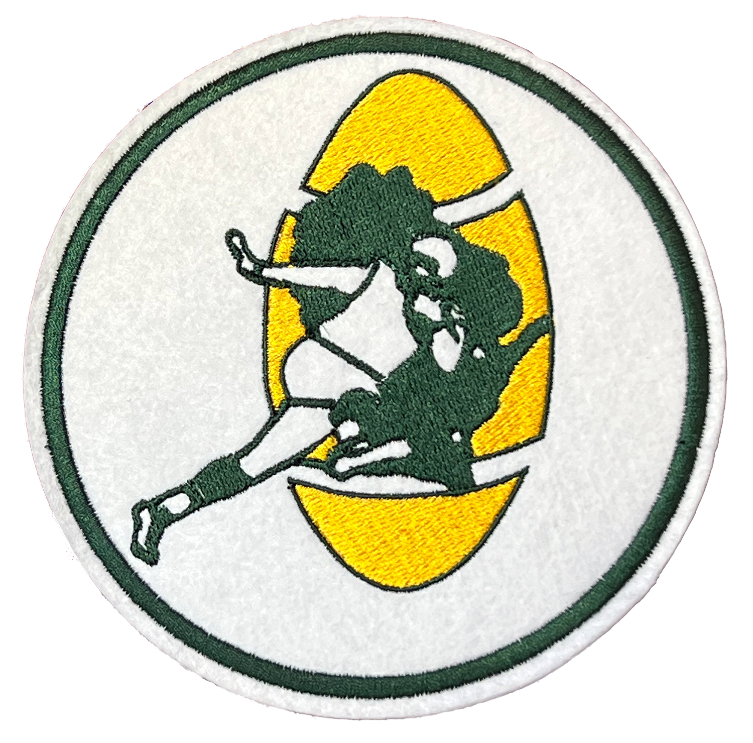 A beautifully embroidered, hand-made vintage style iron-on patch of the Green Bay Packers, 1968-1979. It's embroidered with bright, vivid, accurate colors on a tough synthetic felt background. The patch is available in several different sizes (inches in diameter).